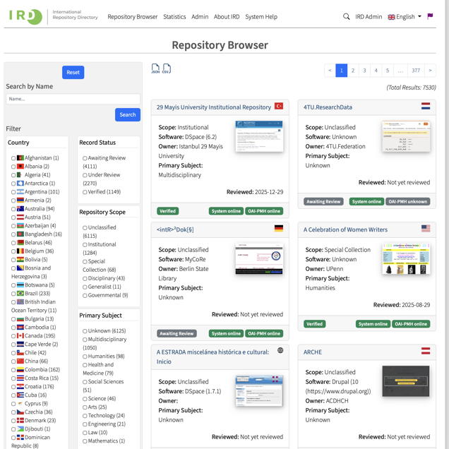 I built and help to maintain COAR's International Repositories Directory (IRD). The directory aims to be an authoritative source of information about Open Access repositories.