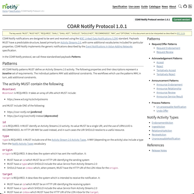 A set of profiles, constraints and conventions around the use of W3C Linked Data Notifications (LDN) to integrate repository systems with relevant services in a distributed, resilient and web-native architecture.
